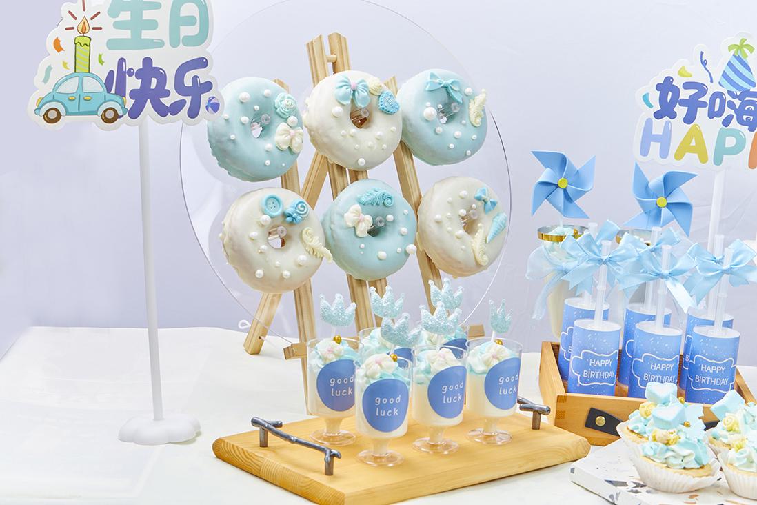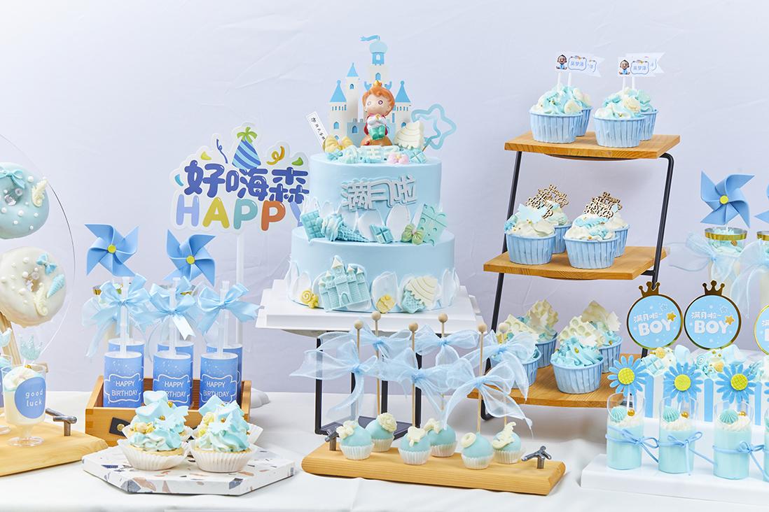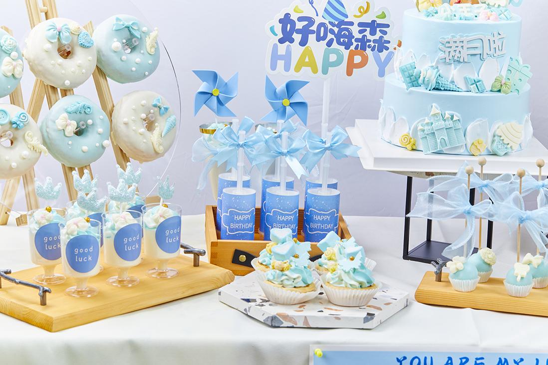 主题蛋糕、纸杯蛋糕、奶油纸杯、精致小西点、蓝色高脚杯