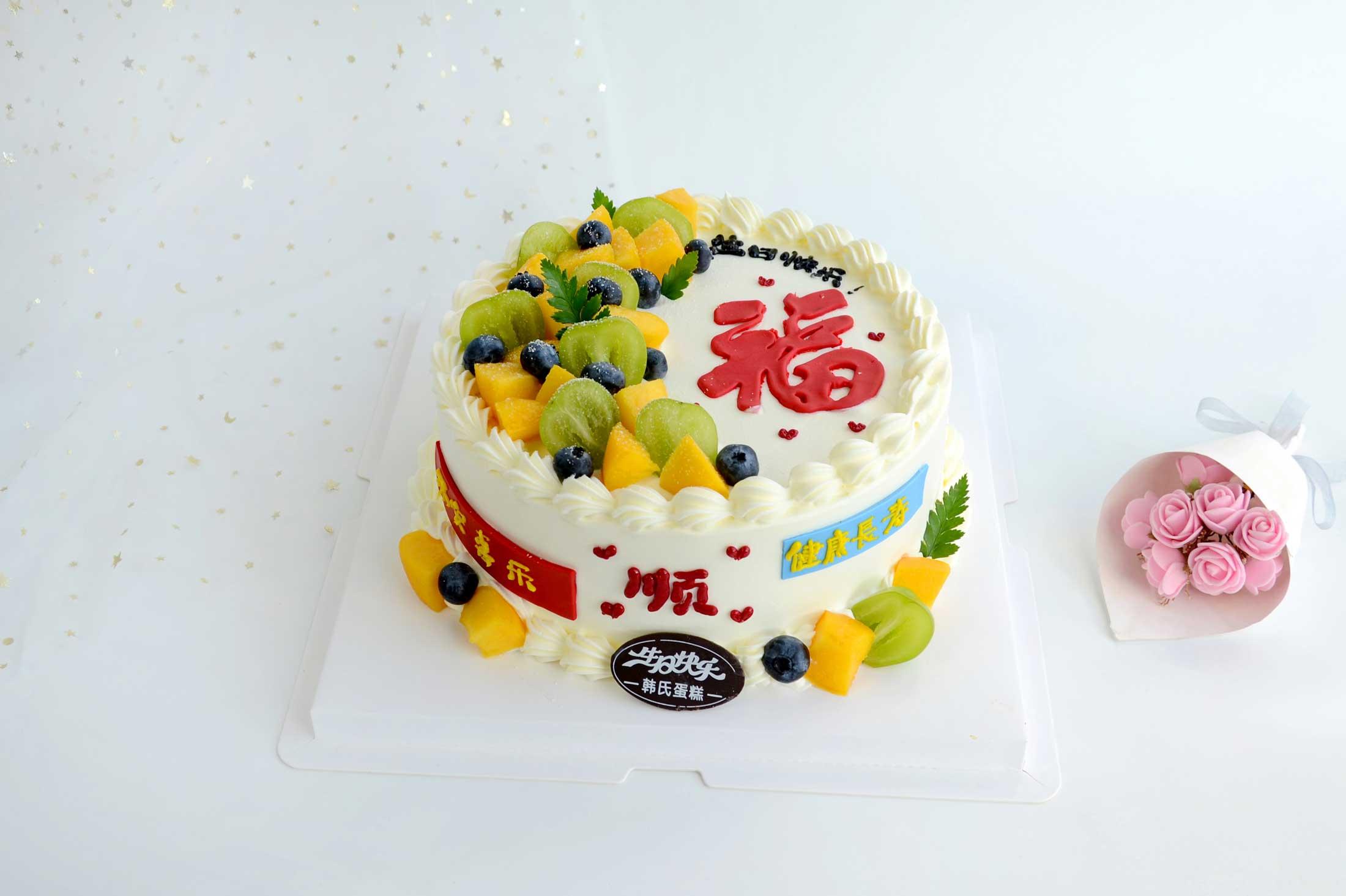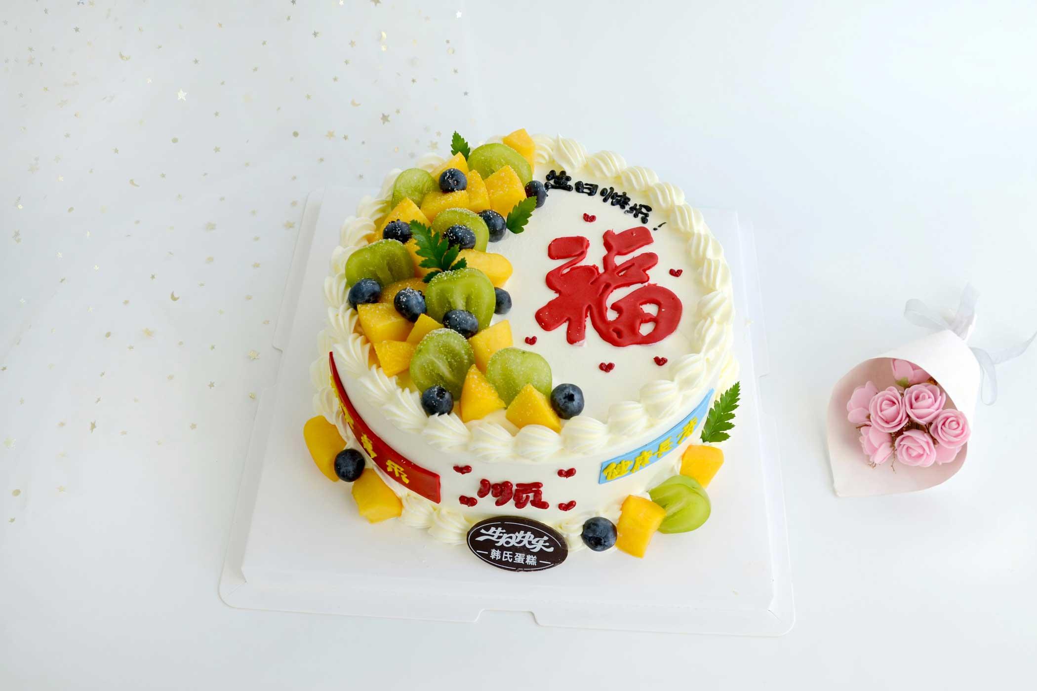 福满鲜果·甜润心间!福字跃然糕体,水果粒环绕成圈,色彩斑斓如生活般绚烂。每一口都是甜蜜暴击,每一眼皆是吉祥如意!