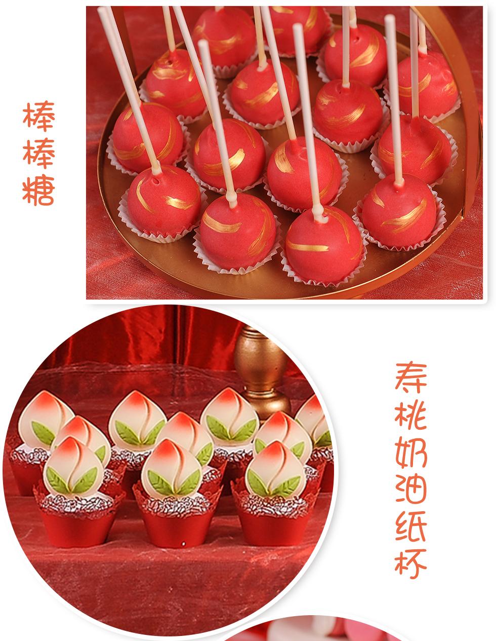 主题蛋糕、棒棒糖、寿桃奶油纸杯、翻糖饼干、慕斯直杯、小西点、马卡龙