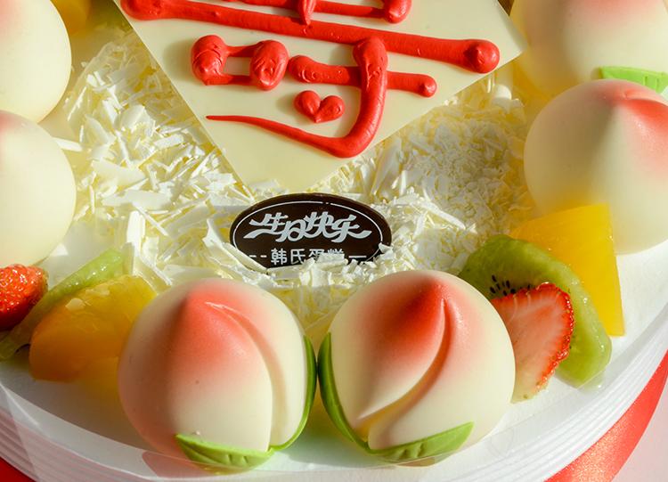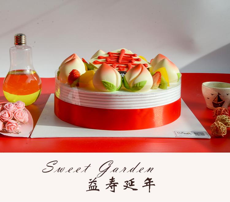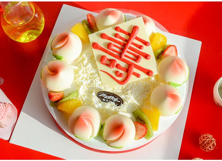 造型吉祥喜庆,托起聚福多寿蟠桃,鲜艳的黄桃和猕猴桃点缀其中,大红“寿”字坐落正中,带给老人由内而外的福乐安康。