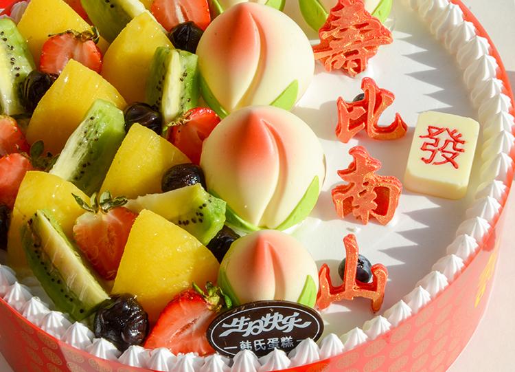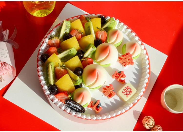 福如东海长流水,寿比南山不老松。此蛋糕精选乳脂淡奶油,不含反式脂肪酸,呵护您和家人的健康。寿桃为可食用巧克力哦